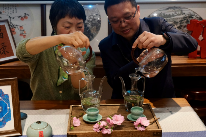 本次活动以节日庆祝为契机,融合校企交流与文化体验,环节设计精巧、氛围温馨浓厚。伴随着悠扬的古琴曲,茶叙活动在“茶香迎客・联心签到”环节中拉开帷幕,女职工们缓步入席,共品安吉白茶、开化龙顶等浙江本土绿茶,茶香氤氲间,瞬间拉近了校企彼此的距离。
